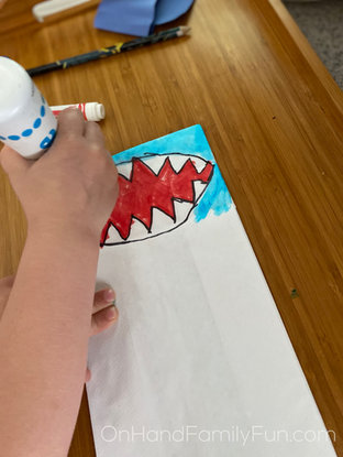 Start with those sharp jaws and pointy teeth. Draw them on the underside of your paper bag where the bottom section folds flat. On the bottom of the bag, you can draw a "closed" mouth by adding a low, curved line. You could even add nostrils here if you wish.